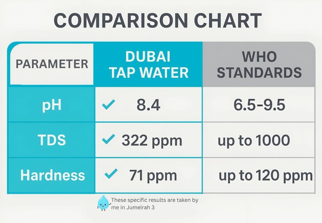 So I personally tested Dubai tap water using a digital TDS, PH meter, DIY test strips to provide a general view of tap water in Dubai (results may vary by location):