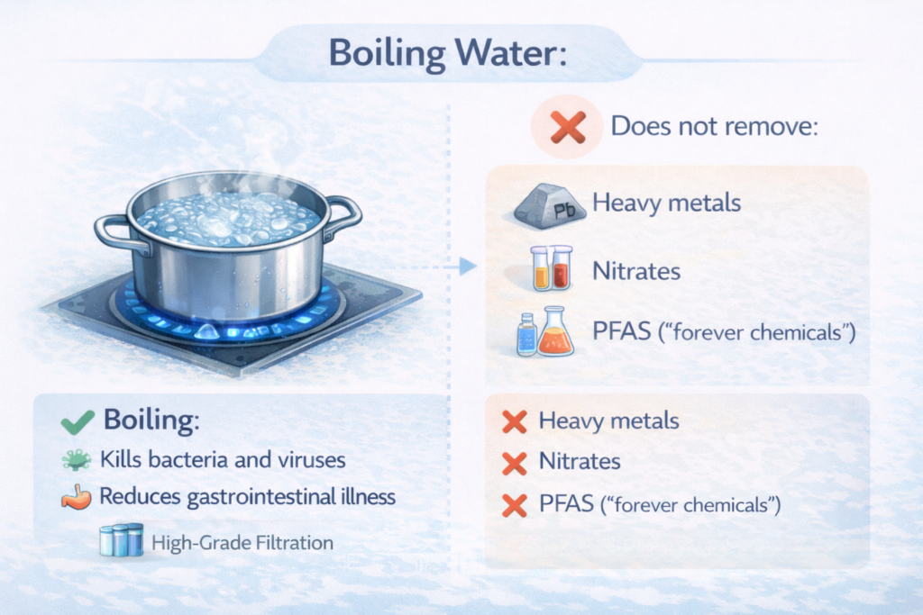 Crucially: Boiling water does not remove PFAS or heavy metals; it could concentrate them as the water volume decreases. The only effective residential barrier against these chemicals is a high-quality Reverse Osmosis (RO) system. Some activated carbon filters are also used to reduce PFAS.