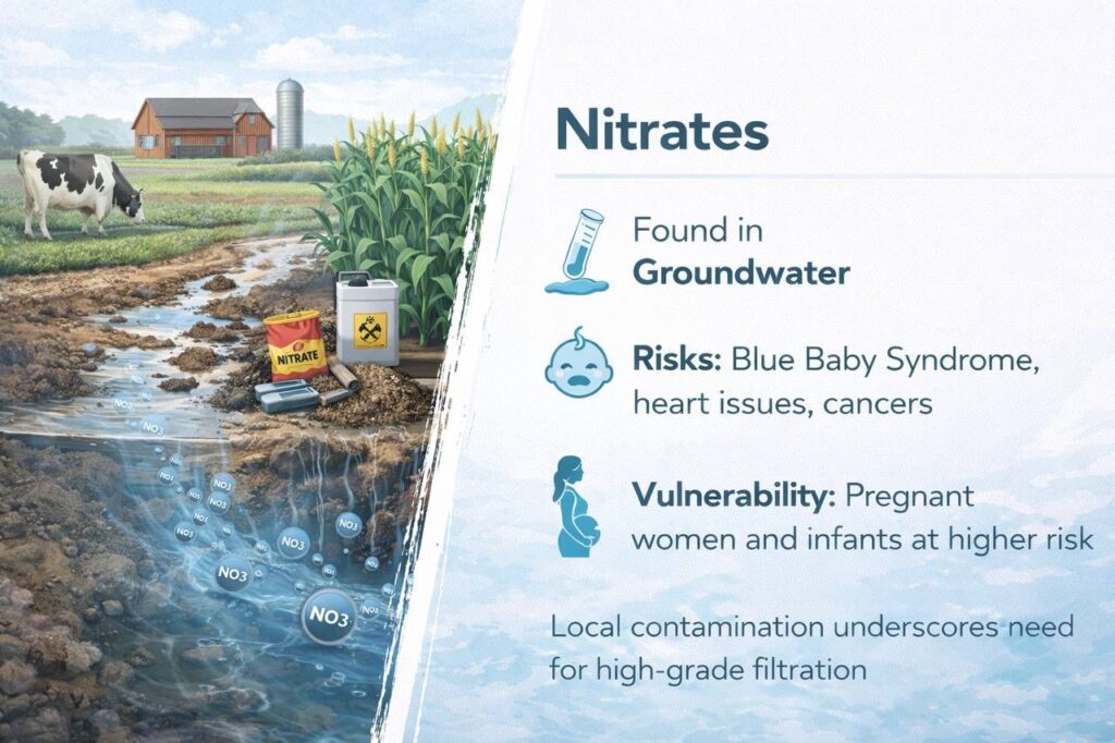 - The Risks: High nitrate levels are particularly dangerous for infants (contributing to “Blue Baby Syndrome” or oxygen deprivation) and have been linked to cardiovascular strain and certain cancers in adults.