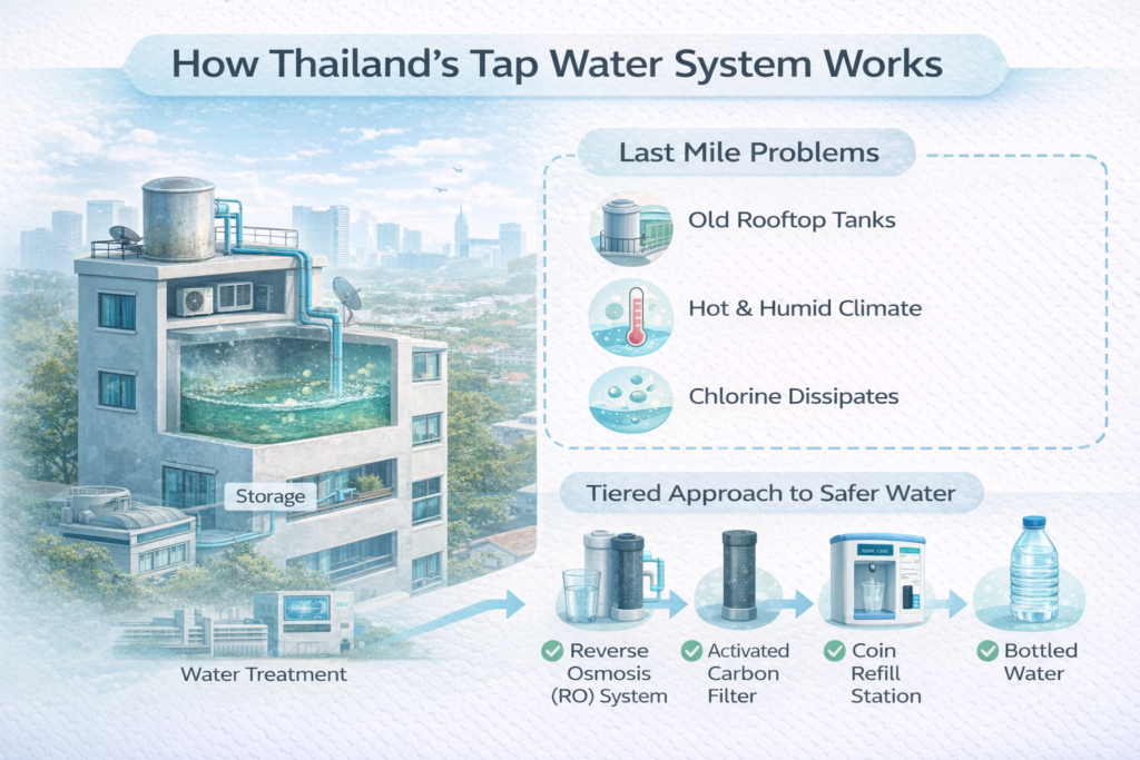Technically, Thailand’s municipal water undergoes modern treatment. However, the “last mile” of delivery is where the safety often breaks down. In many residential buildings,